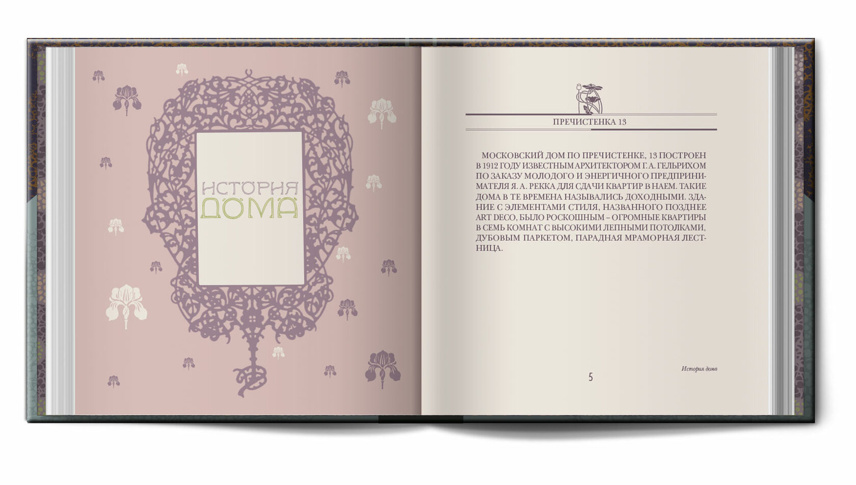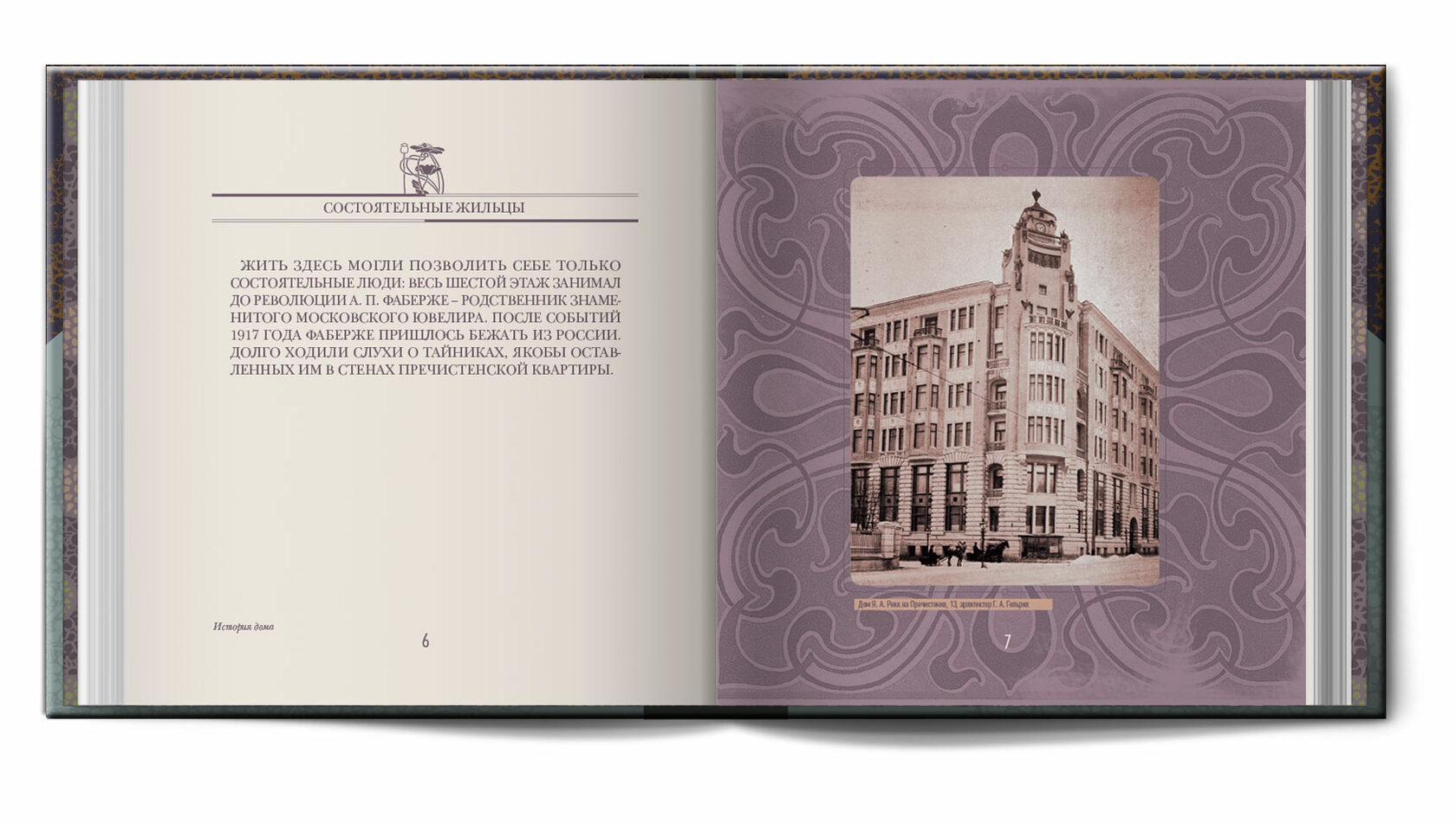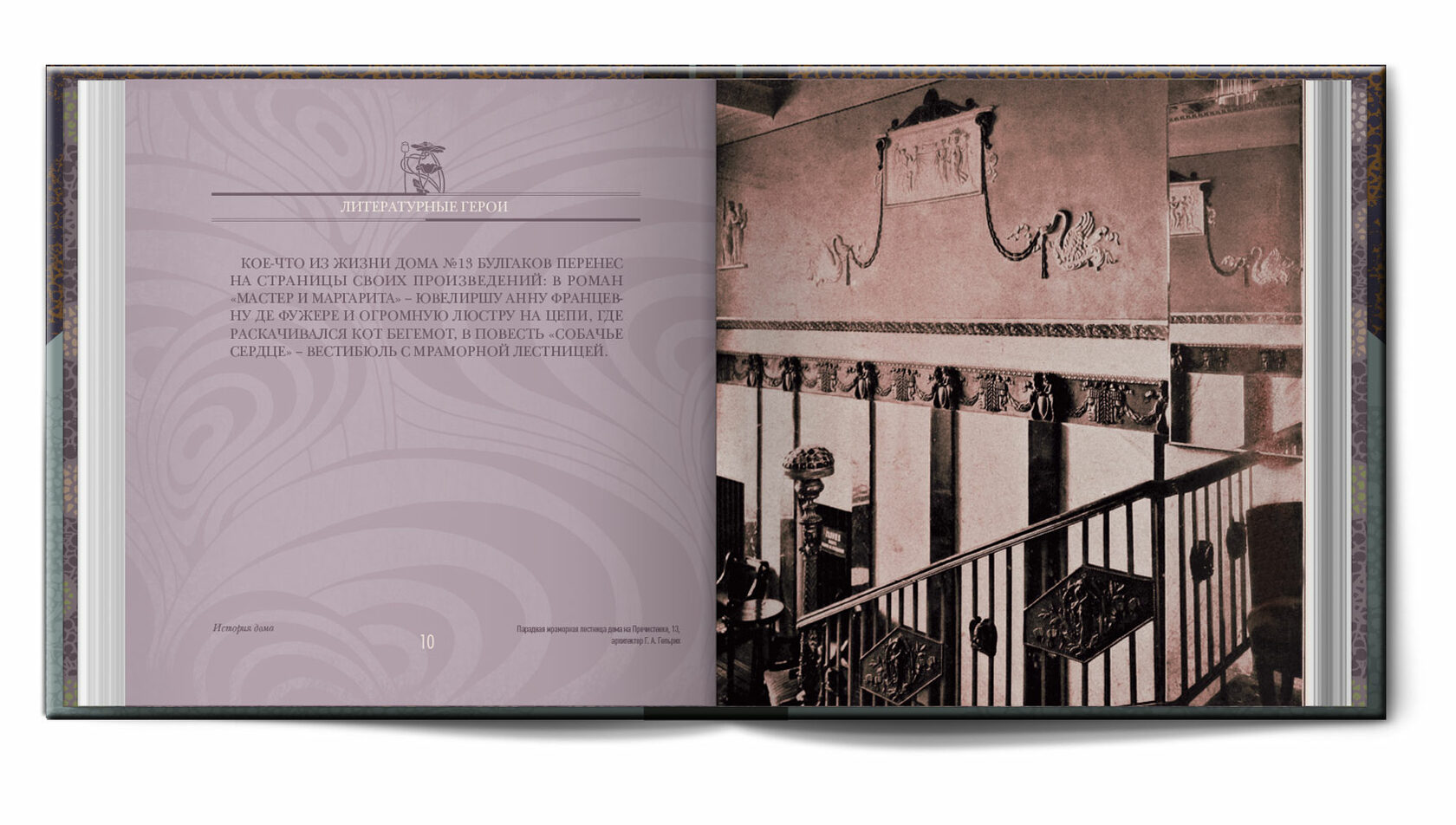 Главный герой этого проекта – дом 13 по улице Пречистенка, дом с историческим прошлым, описанный в романах Булгакова «Собачье сердце» и «Мастер и Маргарита». Аутентичный для дома и его времени стиль ар-деко богато представлен в оформлении книг: орнаментах, фактурах, иллюстрациях.