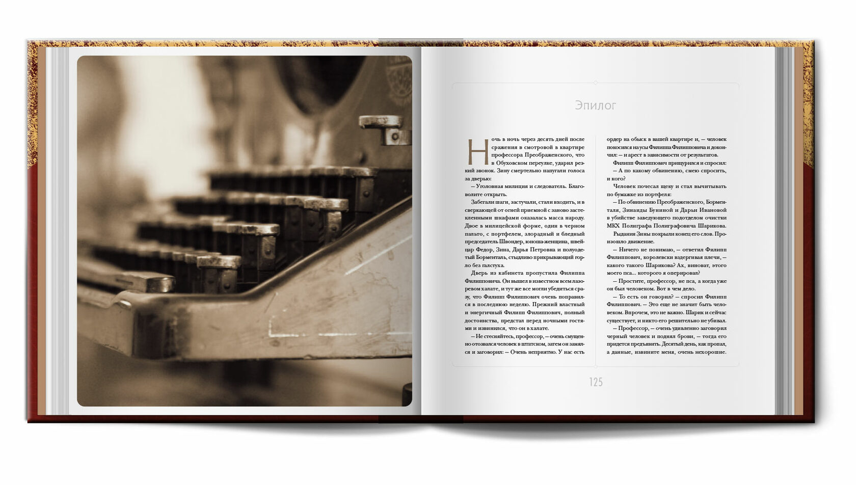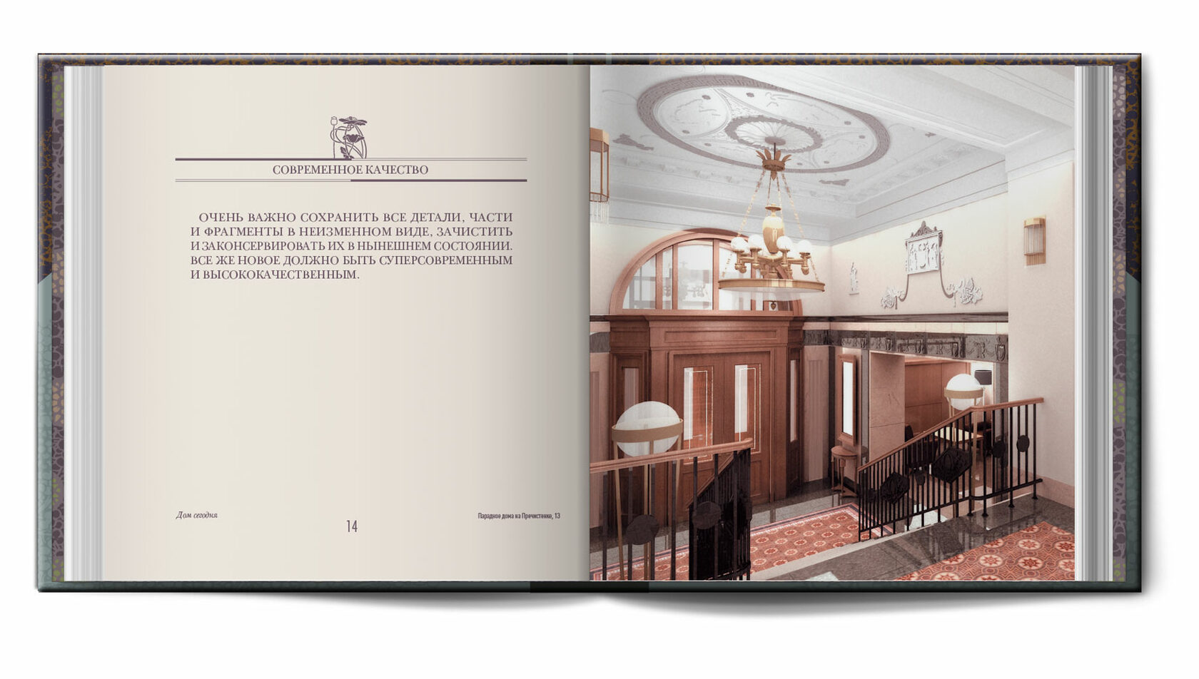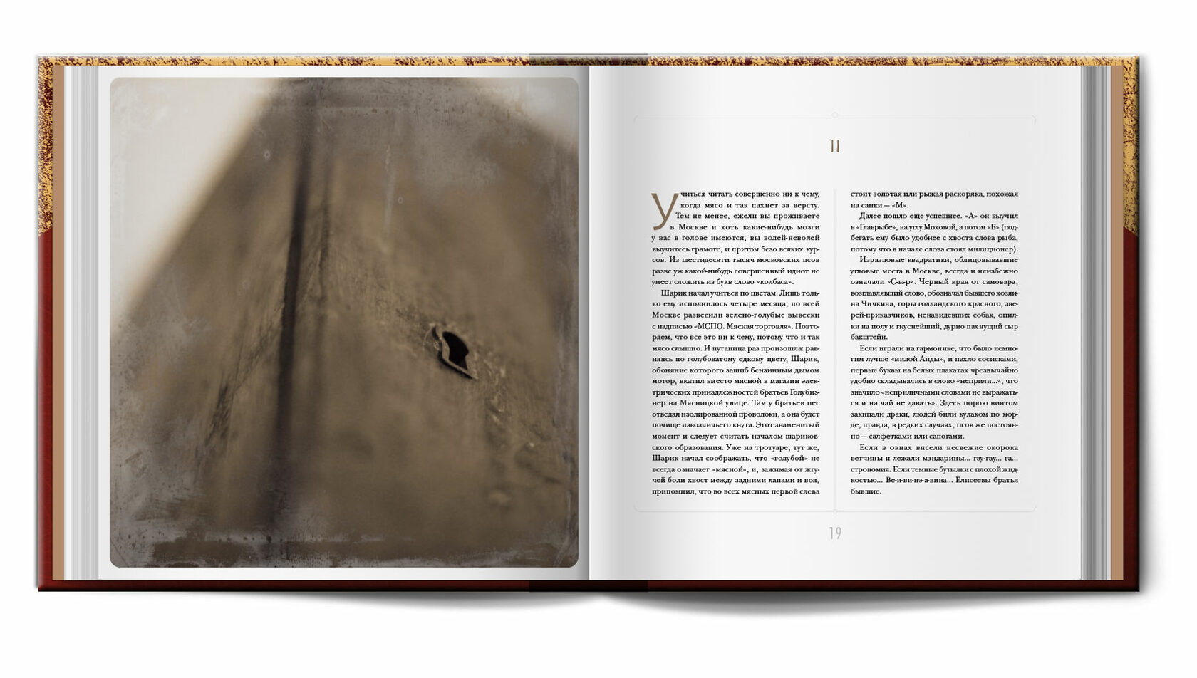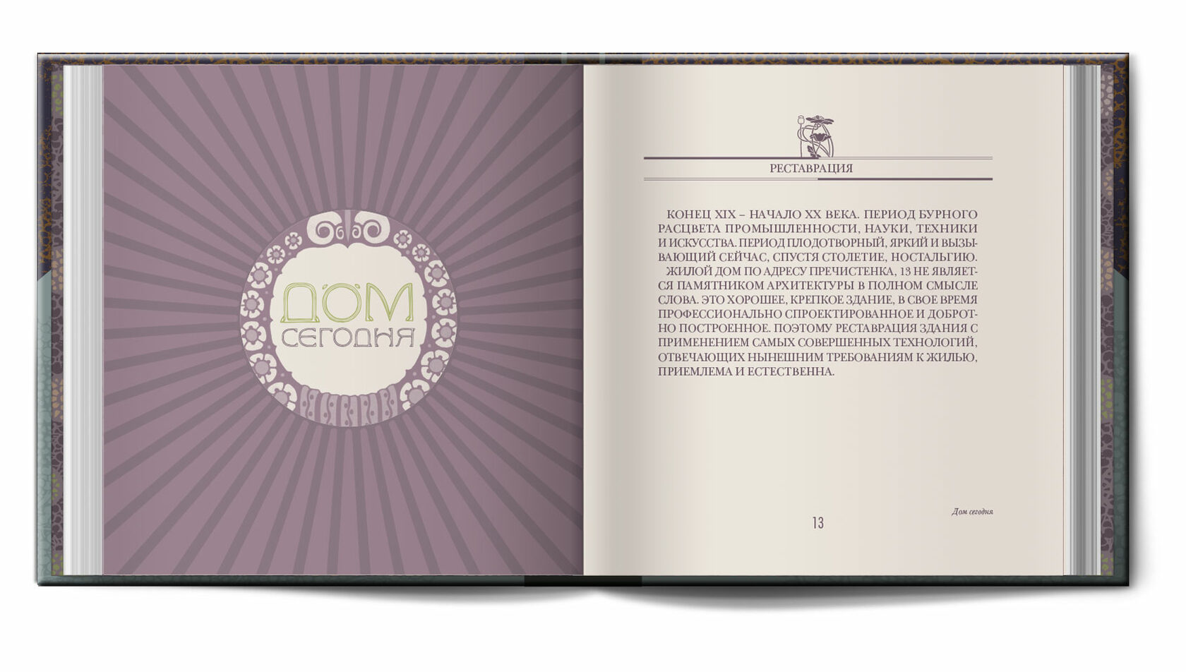 Главный герой этого проекта – дом 13 по улице Пречистенка, дом с историческим прошлым, описанный в романах Булгакова «Собачье сердце» и «Мастер и Маргарита». Аутентичный для дома и его времени стиль ар-деко богато представлен в оформлении книг: орнаментах, фактурах, иллюстрациях.